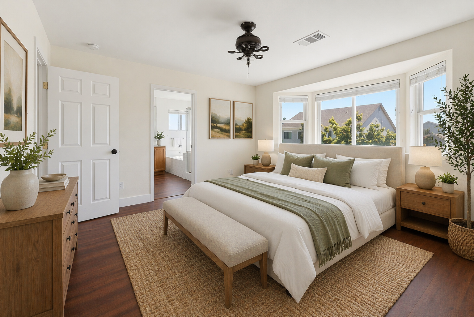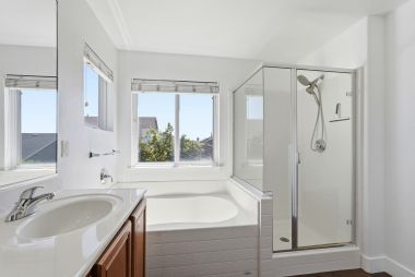 Upstairs, the spacious primary suite serves as a private retreat, highlighted by a bay window that brings in additional natural light. The en-suite bathroom offers a double vanity, wide mirror, soaking tub with tile surround, and a separate glass-enclosed shower—providing a spa-like experience at home. Two additional bedrooms with ceiling fans and ample windows complete the upper level.