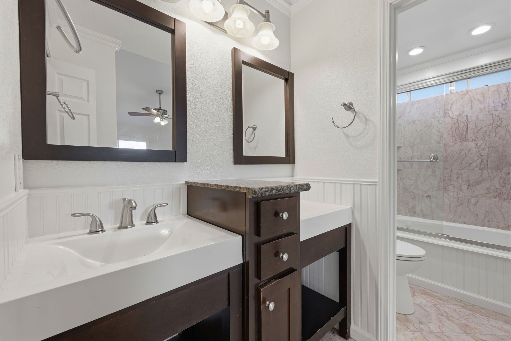 The heart of the home is the updated kitchen, designed with both function and style in mind. It features granite countertops, a center island for additional prep space, stainless steel appliances, and elegant plantation shutters that allow natural light in while maintaining privacy. Whether you're preparing meals or hosting guests, this kitchen offers the perfect balance of practicality and charm.
