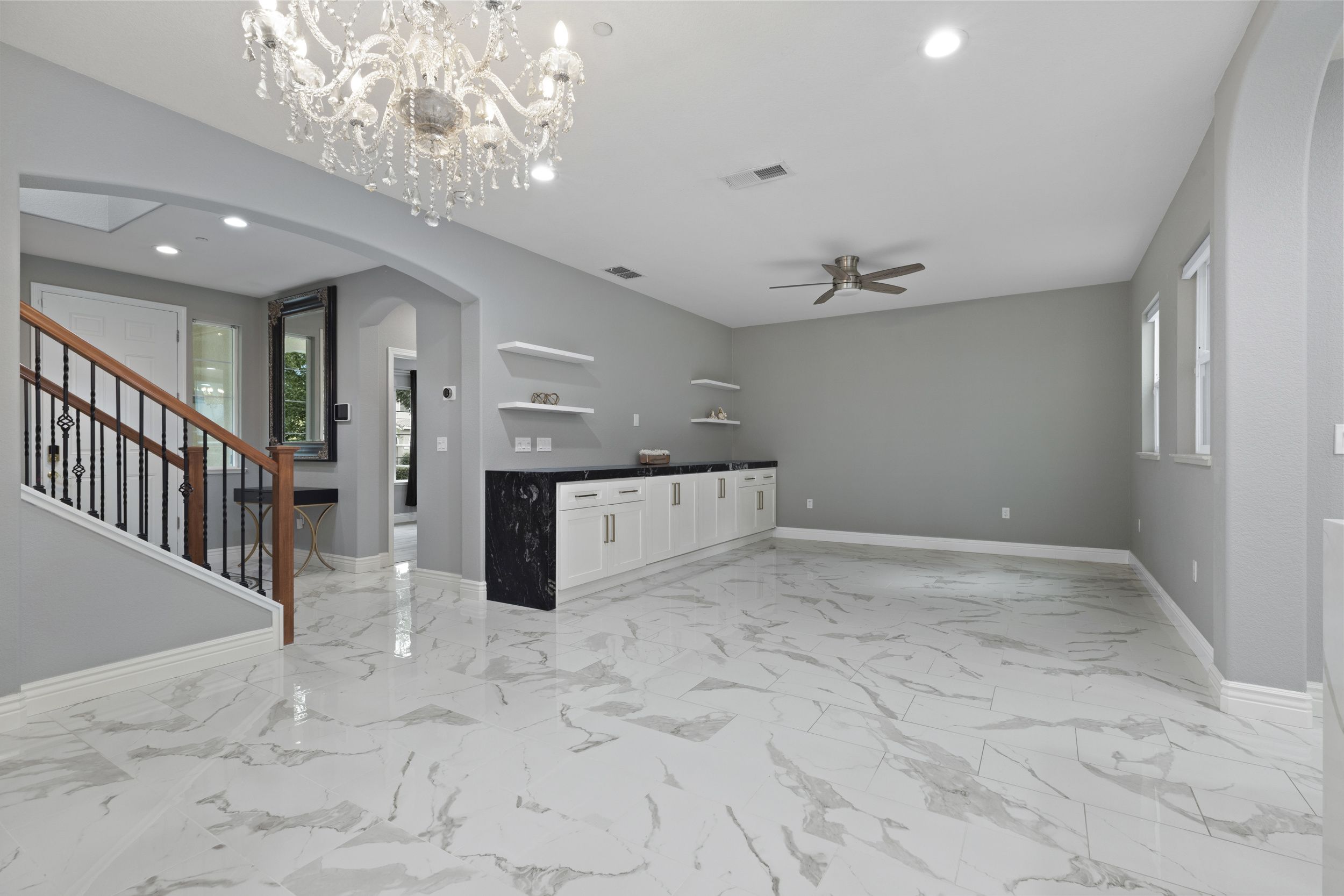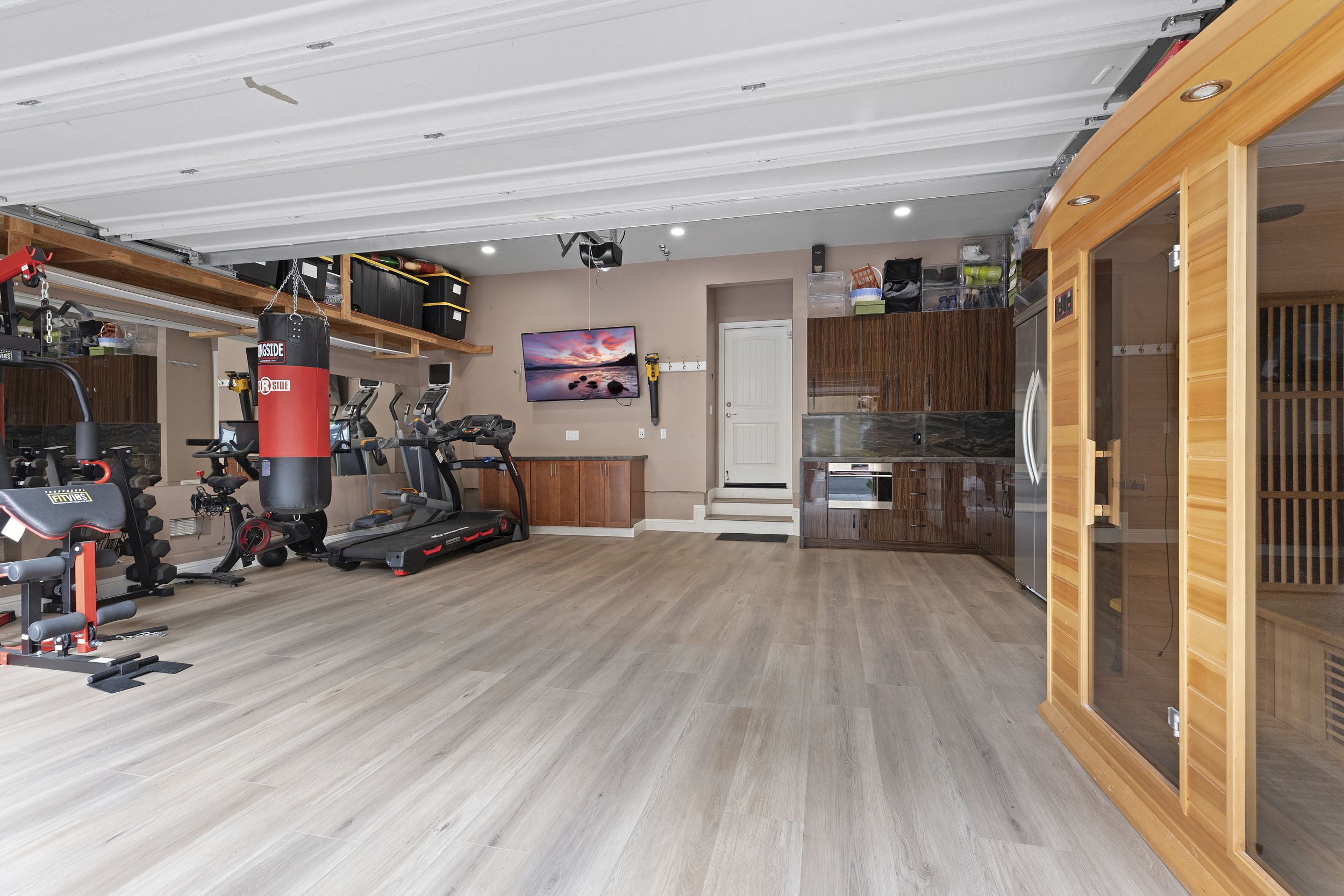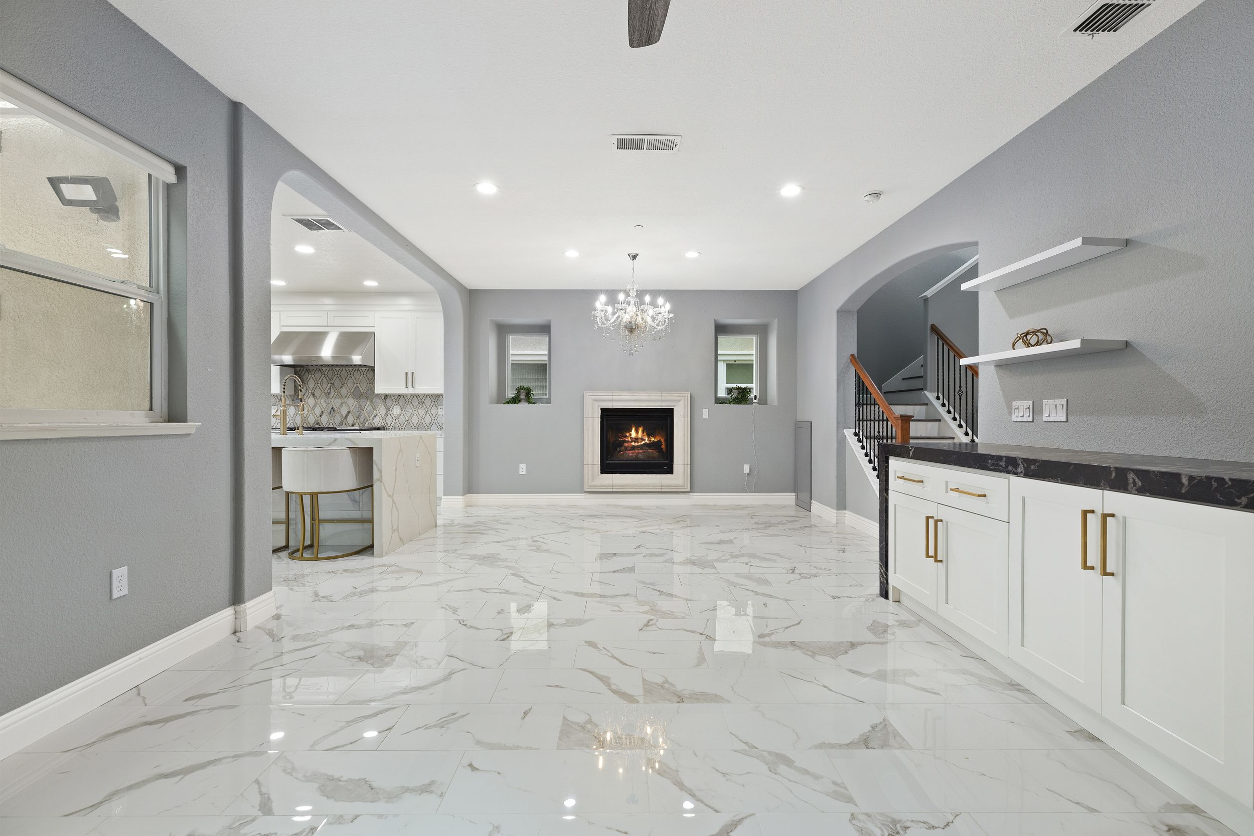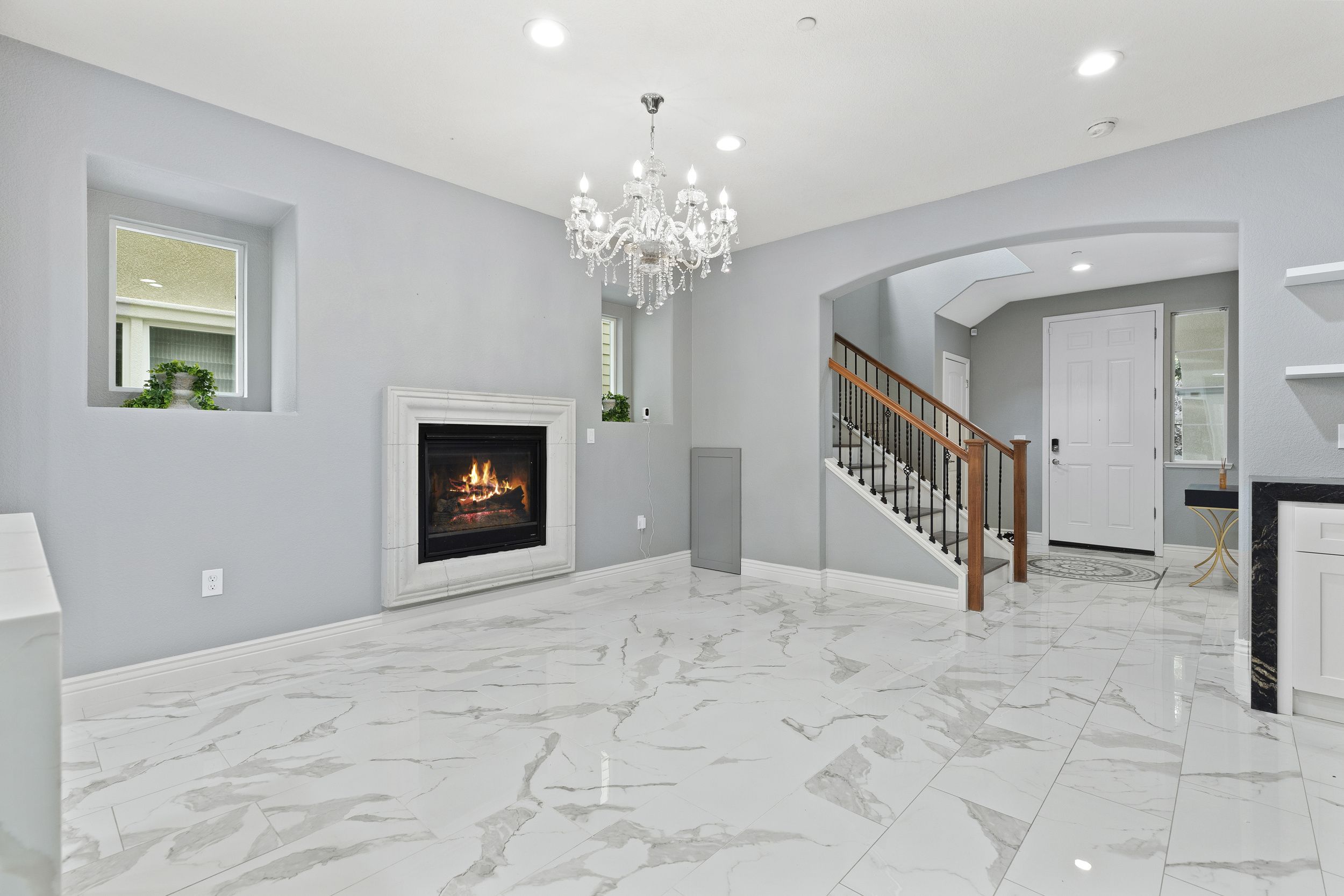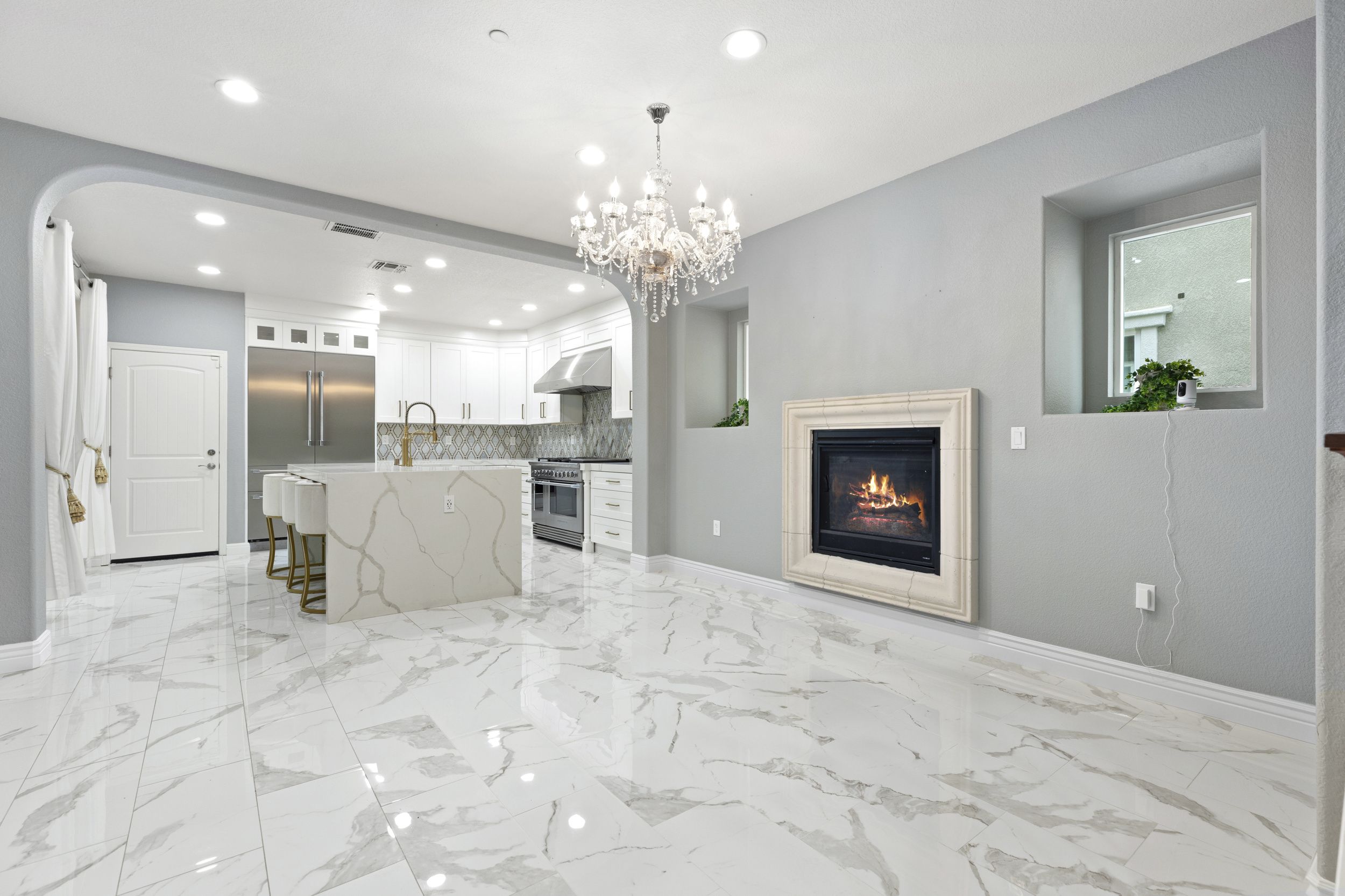 This east-facing property features Mercer porcelain tile flooring throughout the main level, a full bedroom and bathroom downstairs, formal living with custom shaker cabinetry and quartz counters, and a dining area with a cozy gas fireplace. The chef's kitchen boasts a quartz waterfall island, 48'' Thermador flush-mount fridge, Bosch dishwasher, Wolf steam oven, Fisher & Paykel 48'' range, Thermador hood, and custom cabinetry. Upstairs includes custom hallway storage, a laundry room with sink, Republic vinyl plank flooring, recessed LED lighting, ceiling fans, and a spacious primary suite with custom wallpaper. The spa-style primary bath features porcelain tile, Cambria quartz, smart mirrors, a jetted tub with electric fireplace, and upgraded bidets in every bathroom. The finished garage offers vinyl flooring, gym setup, flat panel TV, built-in kitchenette, 42'' KitchenAid fridge, overhead storage, and an upgraded 70-amp Tesla charger.
