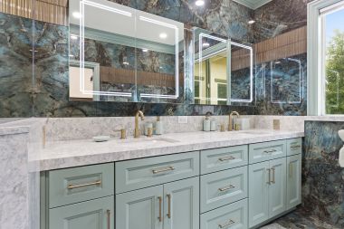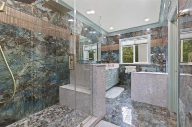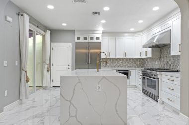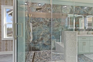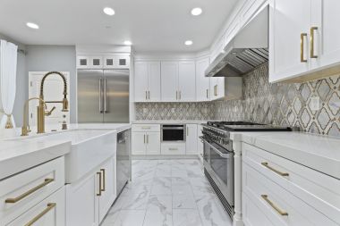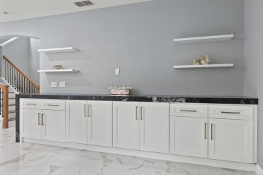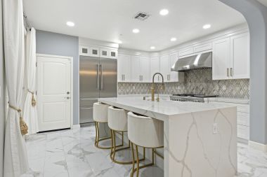 The heart of this home is its chef-inspired kitchen, designed to impress both culinary enthusiasts and casual entertainers. A dramatic quartz waterfall island anchors the space, complemented by custom shaker cabinetry and high-end finishes. Equipped with a 48” Thermador flush-mount refrigerator, Bosch dishwasher, Wolf steam oven, Fisher & Paykel 48” professional range, and Thermador hood, this kitchen is built to handle gourmet meals and everyday cooking with ease. It’s as functional as it is beautiful, making it the centerpiece for gatherings.