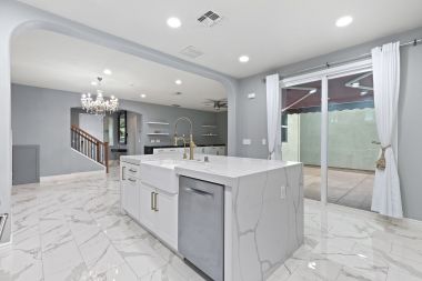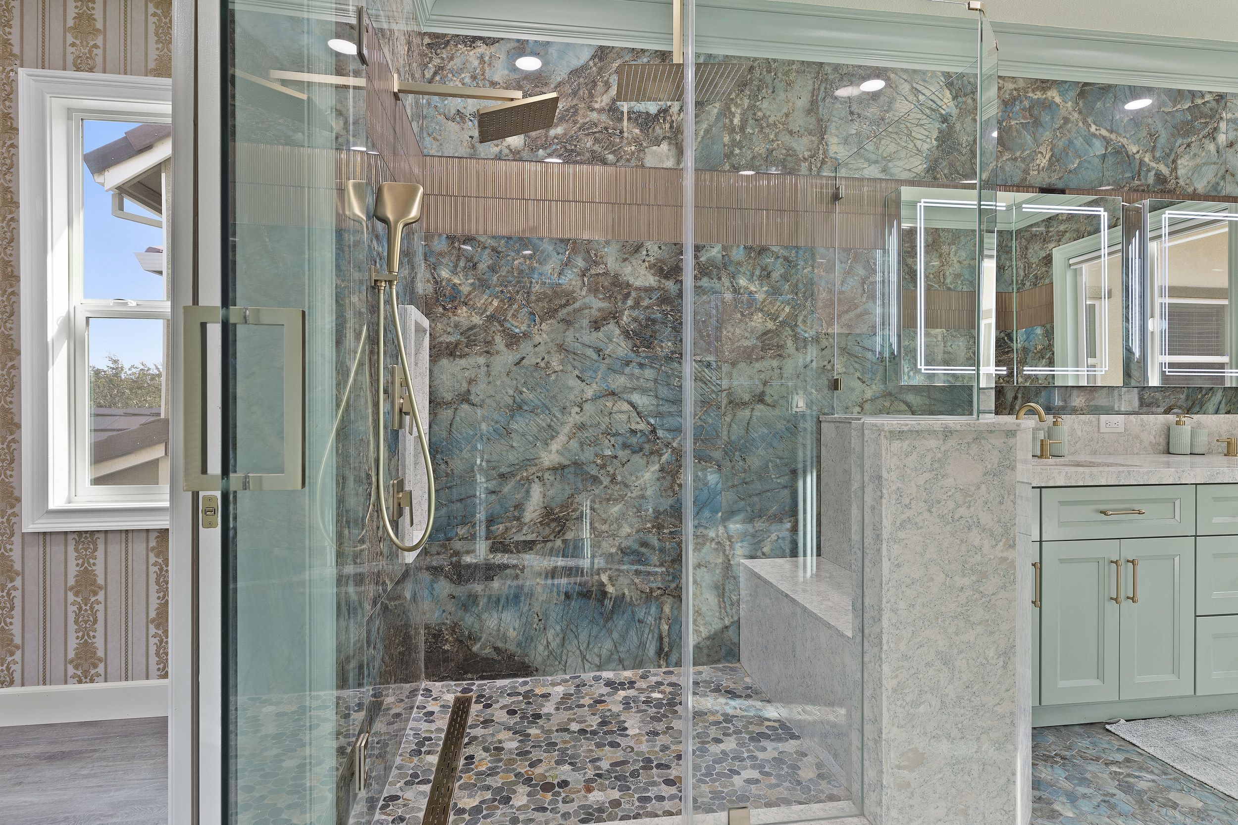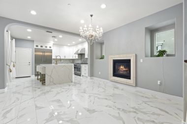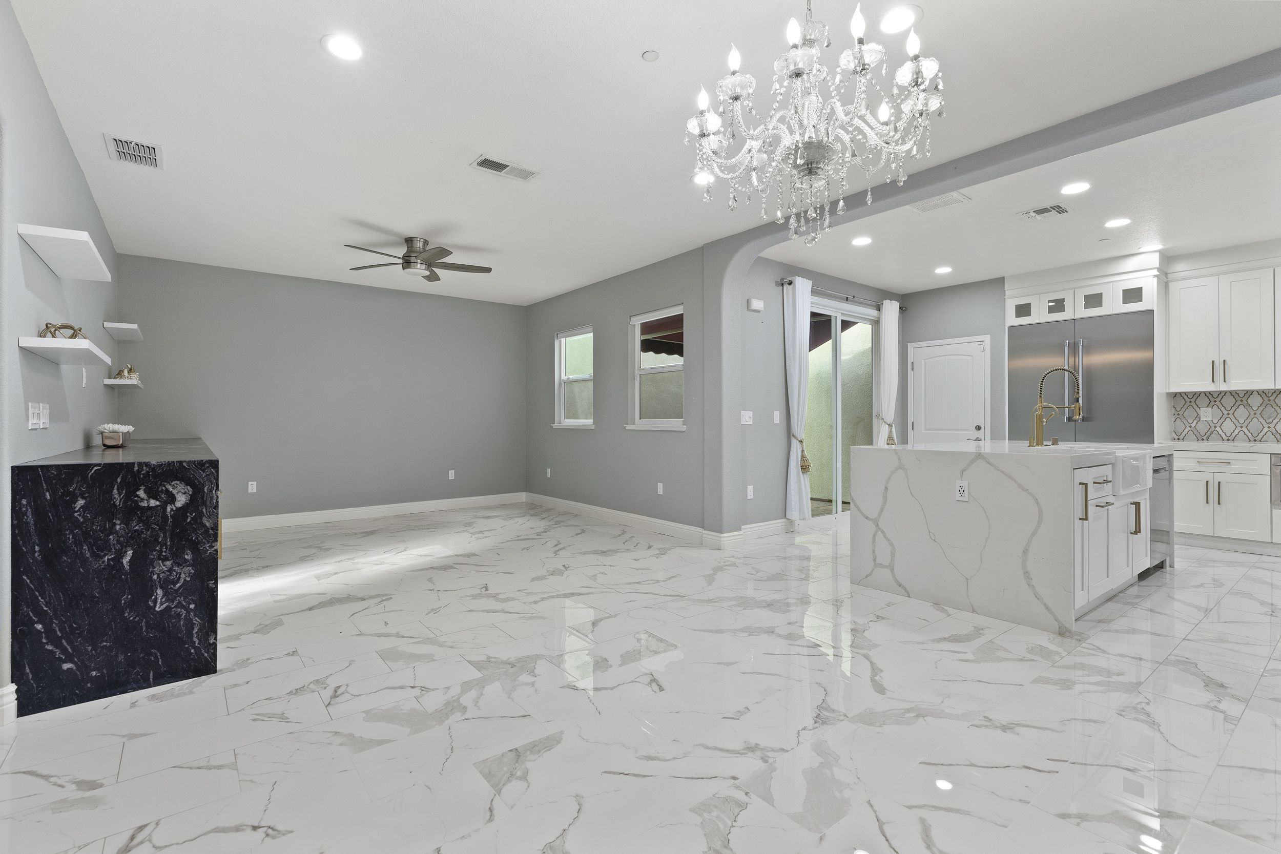Enjoy custom backyard hardscaping, a motorized retractable patio cover, and a pergola with built-in heaters. Includes owned solar and a Navien tankless water heater.