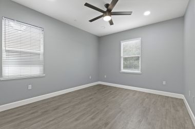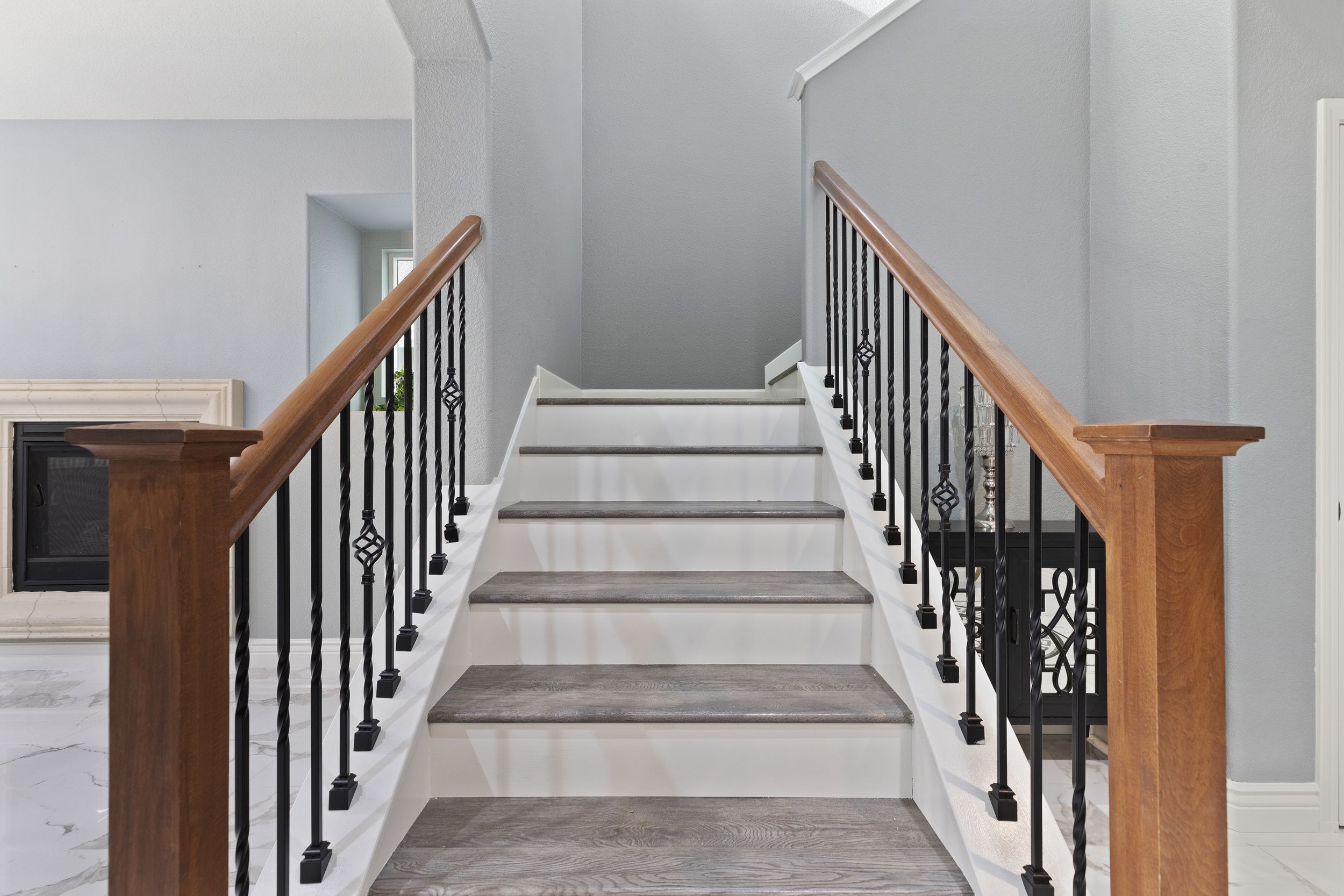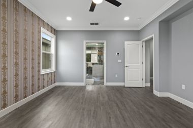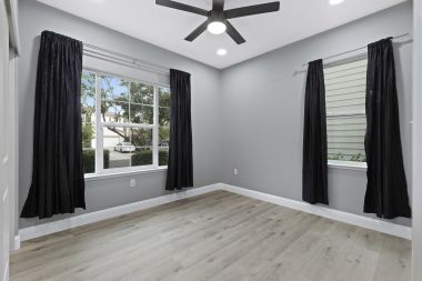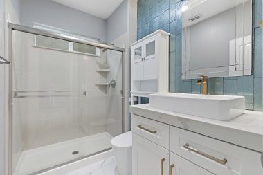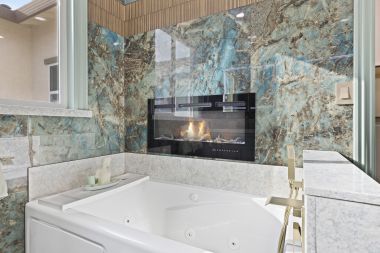 Upstairs, the primary suite is a true sanctuary, featuring designer wallpaper and spacious design that sets a calm, sophisticated tone. The en-suite bathroom rivals a luxury spa, boasting floor-to-ceiling porcelain tile, Cambria quartz counters, smart LED mirrors, and a jetted tub complete with its own electric fireplace. Every bathroom in the home is upgraded with bidets, ensuring a thoughtful touch of convenience and comfort throughout.