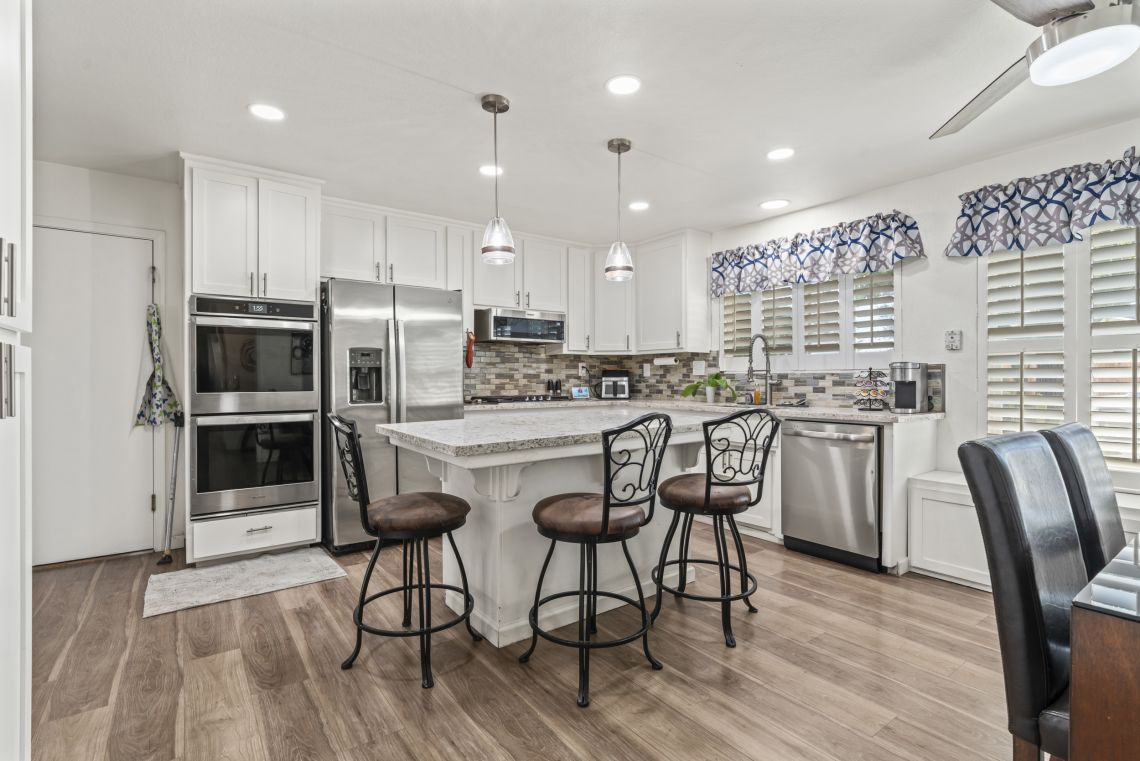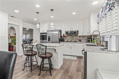 Inside, you’ll find 1,957 square feet of thoughtfully updated living space, starting with a welcoming open floor plan filled with natural light and finished with elegant water-resistant flooring throughout the main areas. The spacious living and dining rooms flow seamlessly into the heart of the home—an updated gourmet kitchen featuring timeless shaker-style cabinetry, quartz countertops, a full tile backsplash, and a large center island perfect for meal prep, casual dining, or entertaining guests.