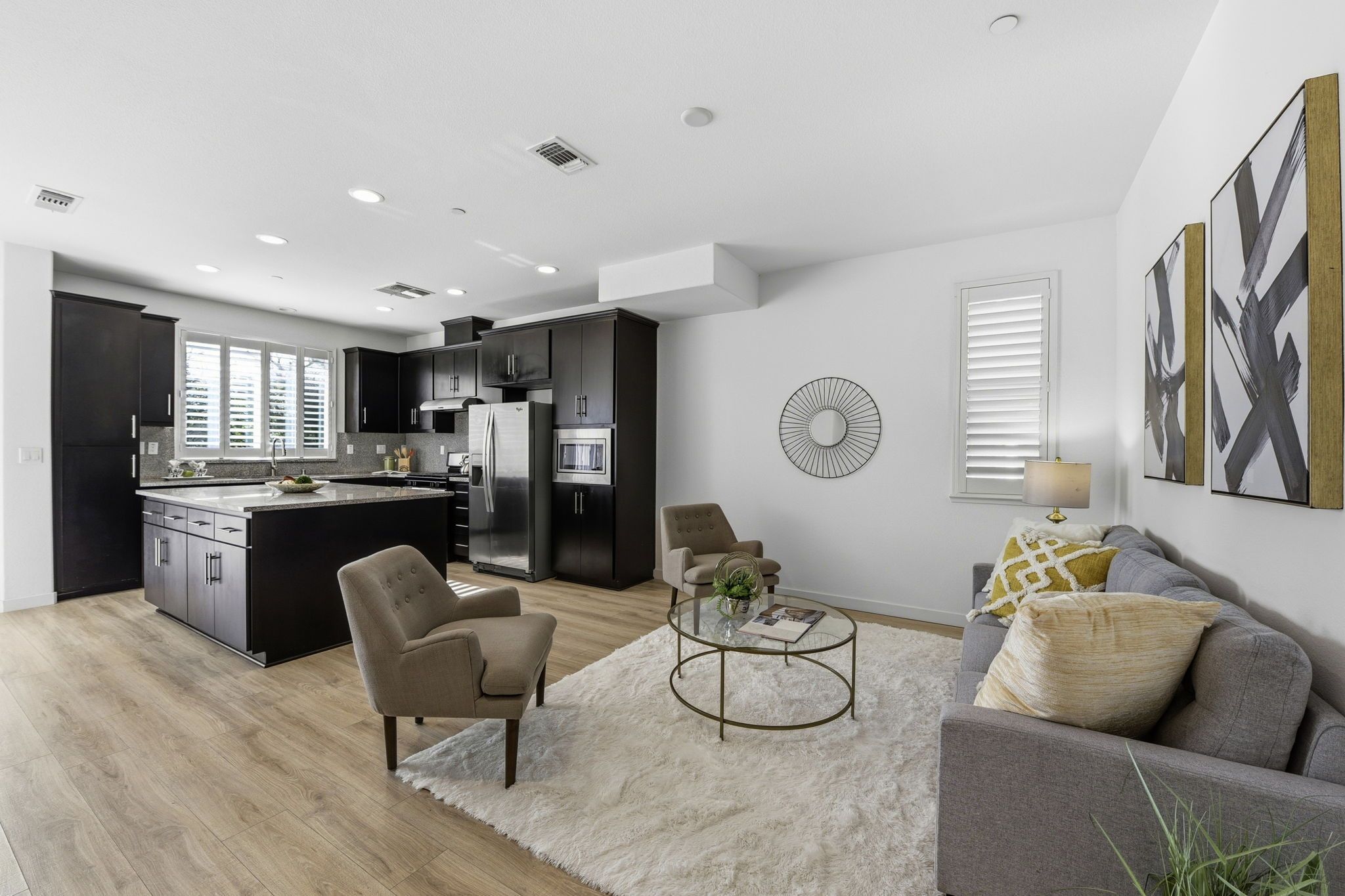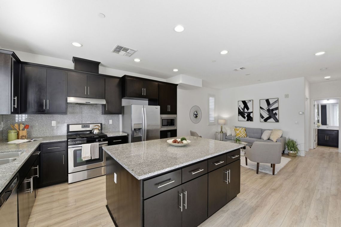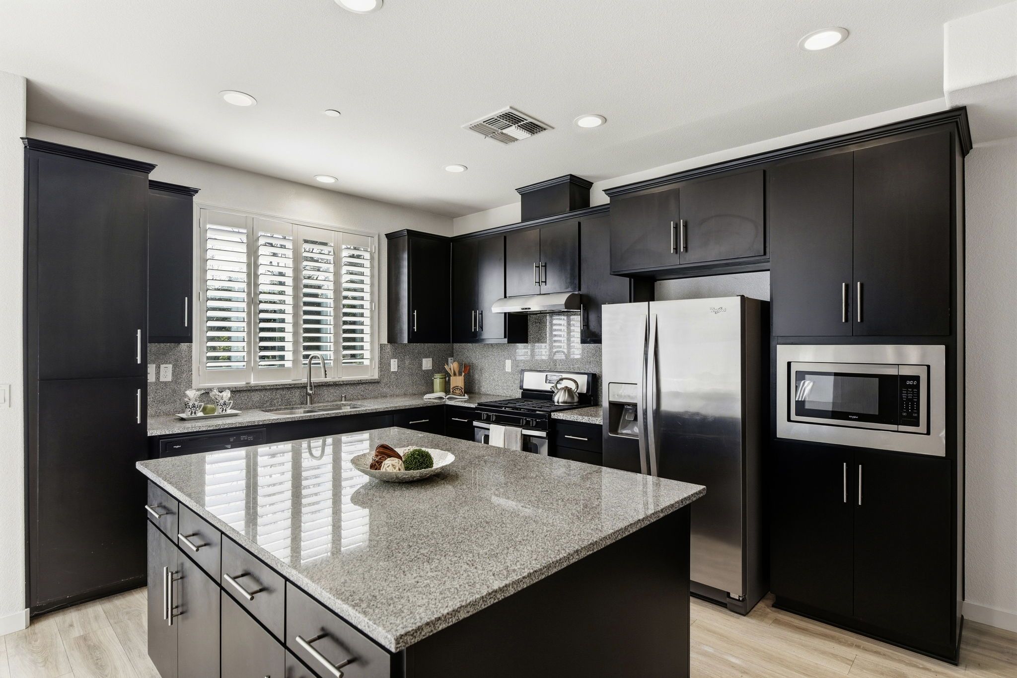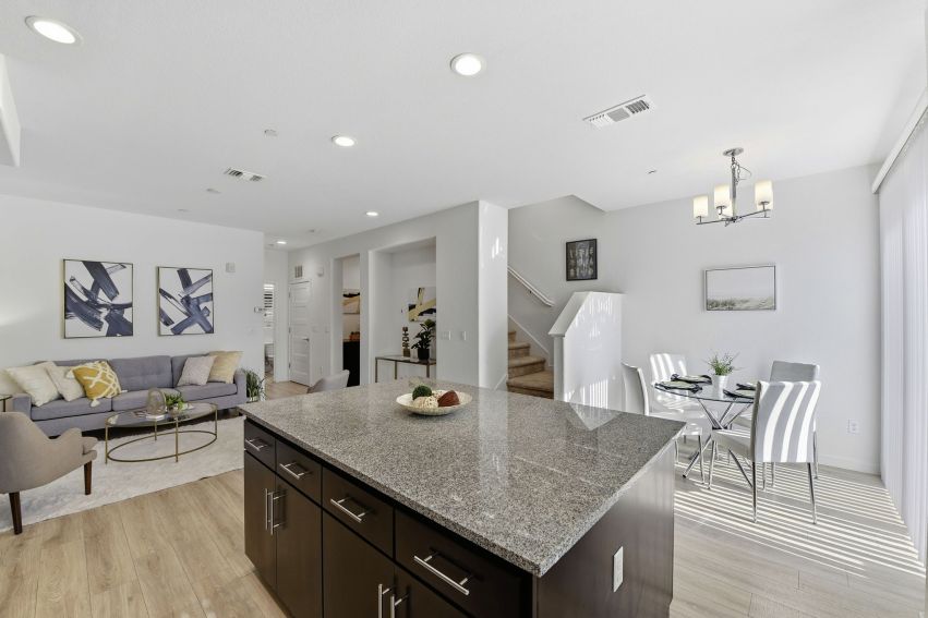 The main living level serves as the heart of the home, showcasing a bright open-concept living and entertaining space. Wide-plank flooring, recessed lighting, and abundant natural light create a warm yet contemporary feel. The seamless flow between the living, dining, and kitchen areas makes it perfect for hosting or simply enjoying everyday living. The kitchen itself is a standout, featuring rich cabinetry, granite countertops, stainless steel appliances, and a large center island that anchors the space—ideal for casual dining, meal prep, or gathering with friends and family.