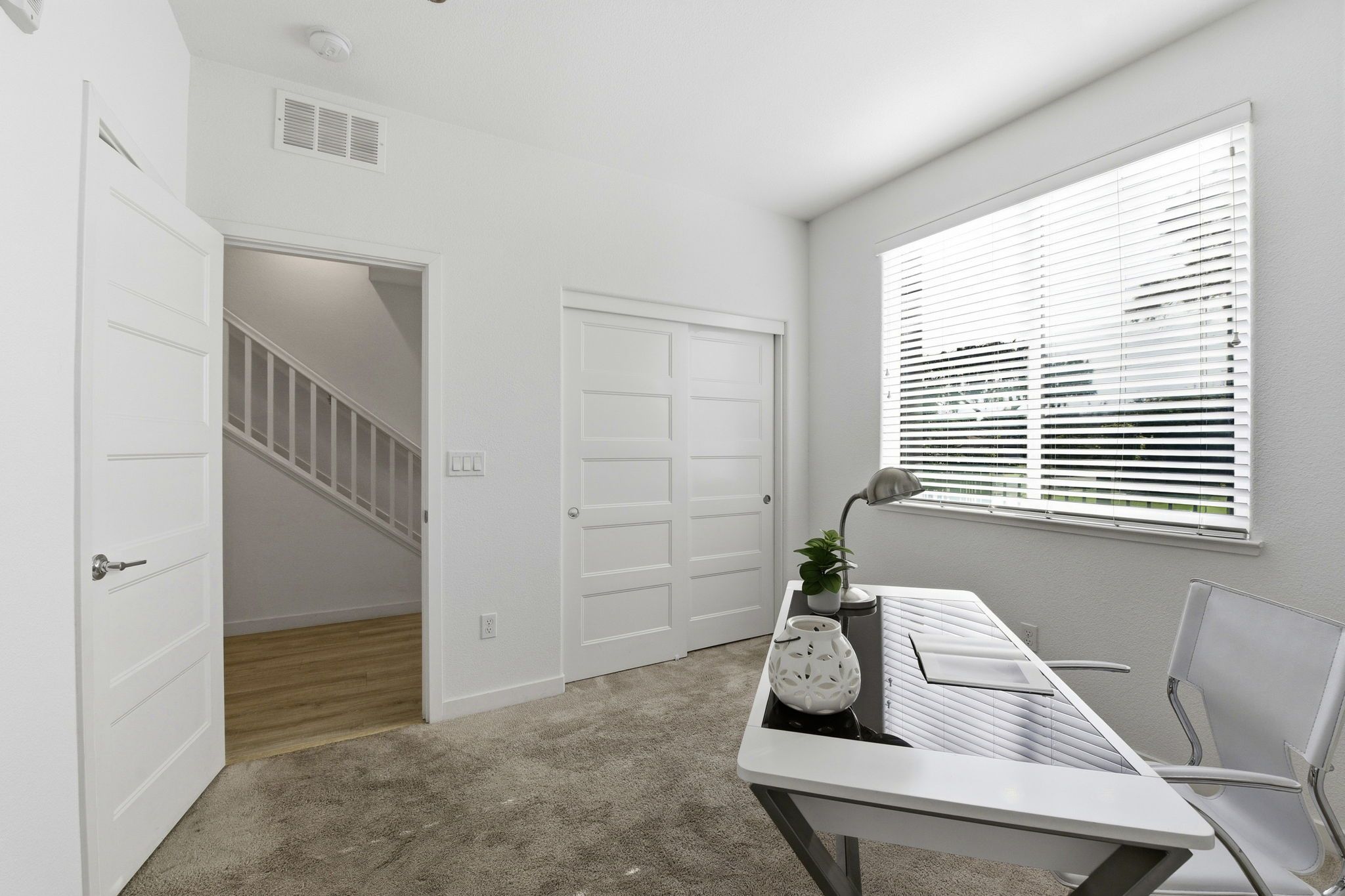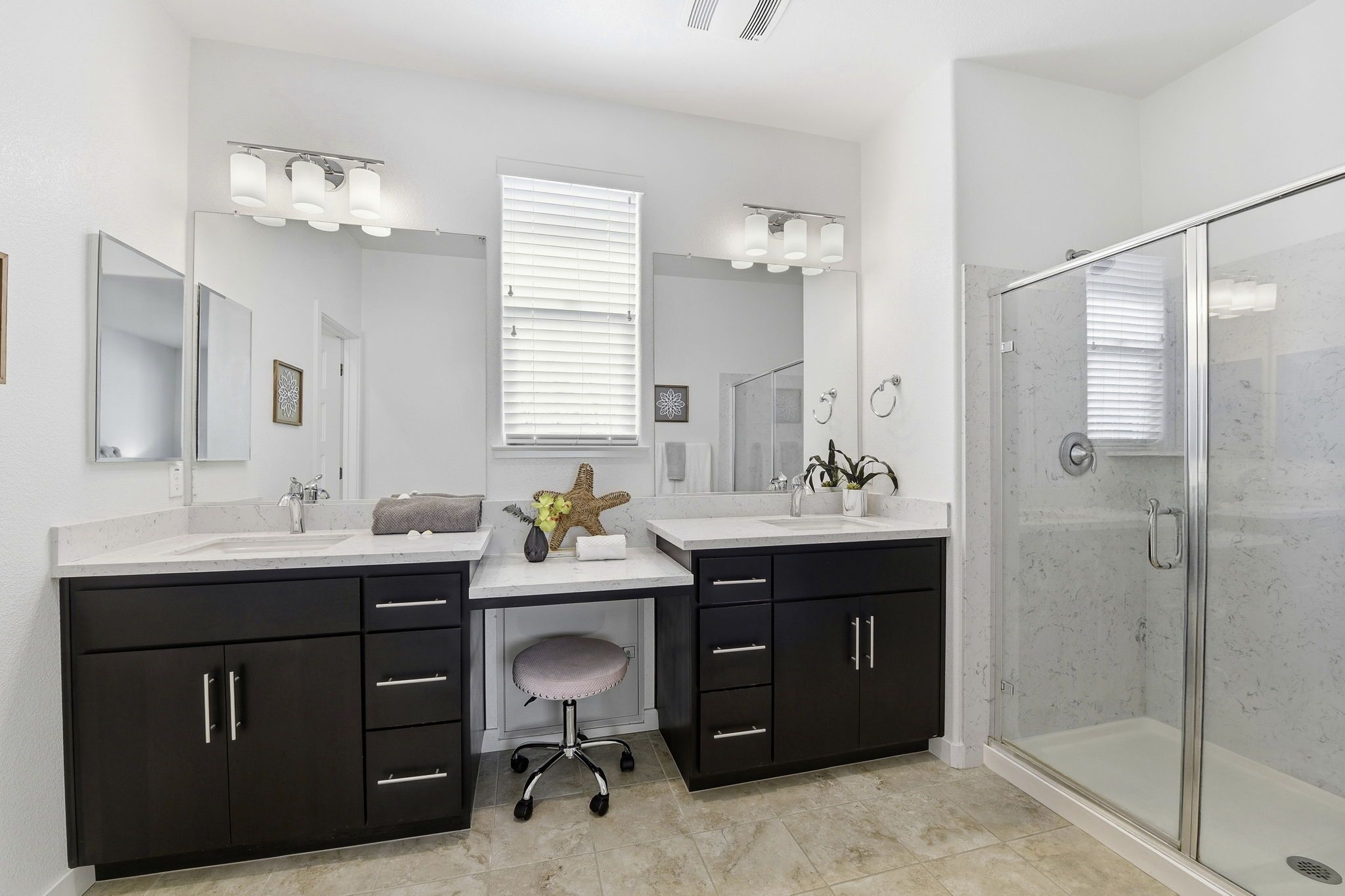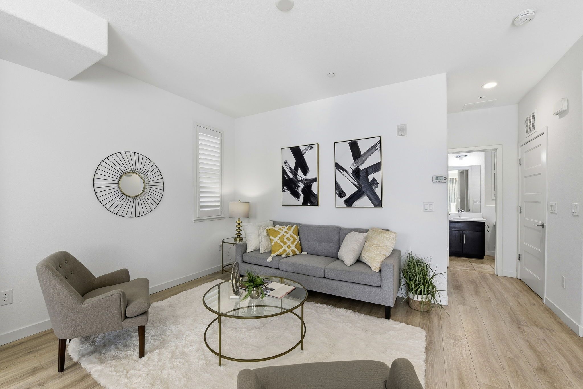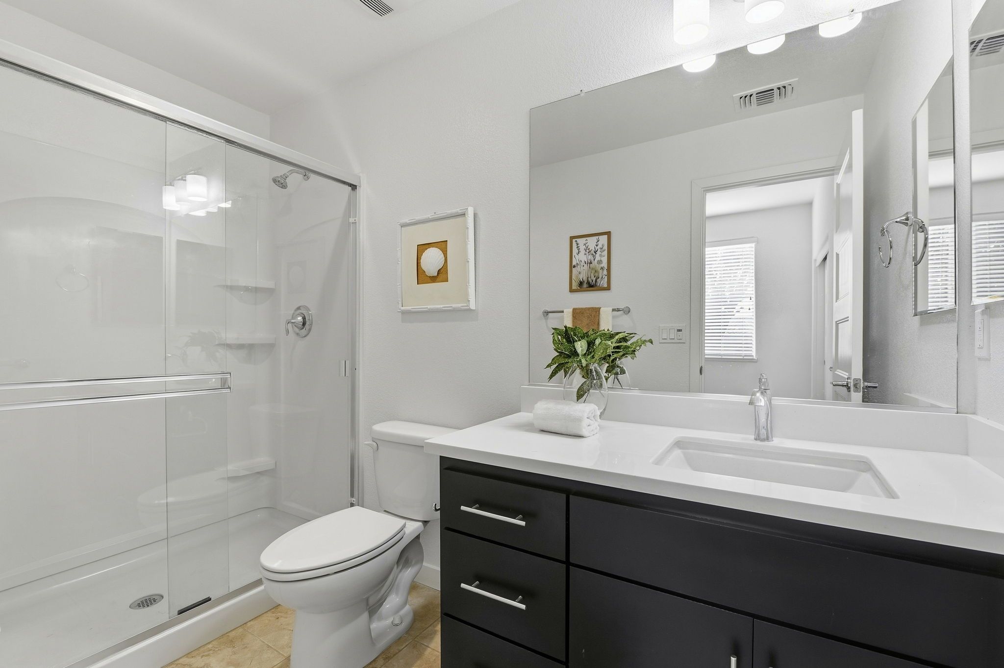 Upstairs, the private primary suite retreat offers a peaceful escape, complete with a spa-inspired bathroom featuring dual vanities and a sleek glass-enclosed shower. The upper level also includes a conveniently located laundry area, adding ease and efficiency to daily routines. Each level of the home is designed with comfort and intention, creating a natural balance between shared living spaces and private retreats.