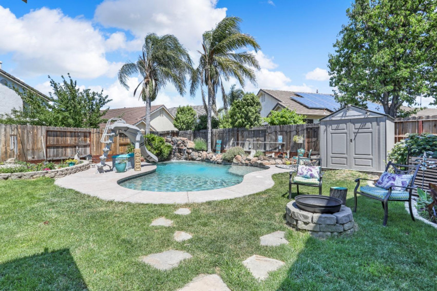 Nestled in the highly sought-after Edgewood community of Tracy, CA, this stunning home at 825 Sunnyside Lane exudes charm and sophistication. Recently upgraded with a flair for modern luxury, this property features engineered hardwood floors and fresh new paint both inside and out, creating a vibrant and inviting atmosphere. The main bathroom is a masterpiece, boasting quartz countertops, a jetted tub, and a sleek, HGTV-ready shower. Imagine entertaining in style with a backyard designed for enjoyment and relaxation, featuring a sparkling pool complete with a waterslide and grotto, surrounded by lush fruit trees. The elegant pergola and cozy firepit provide the perfect setting for evening gatherings, while the handy shed offers additional storage solutions. Energy efficiency is at the forefront with Tesla solar panels powering your home needs, complemented by a traditional wood-burning fireplace for those cooler evenings. Located conveniently close to the ACE commuter train, this home offers the perfect blend of comfort and accessibility.